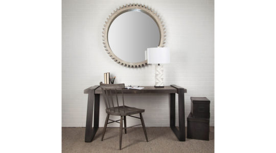 Crafted from wood and finished in a grey wash finish, the Cog Mirror IV is a stunning round mirror with triangular, cog-like grooves on the frame. Spanning 44″ in diameter, this stylish wall mirror looks gorgeous by itself or when grouped with others in the Cog Mirror series as a collection, especially in spaces based on the Industrial design styles.