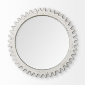 Crafted from wood and finished in a white tone, the Sundance Cog I is a stunning round mirror with triangular, cog-like grooves on the frame. Spanning 35″ in diameter, this stylish wall mirror looks gorgeous by itself or when grouped with others in the Sundance Cog & Cog Mirror series as a collection, especially in spaces based on the Industrial design styles.